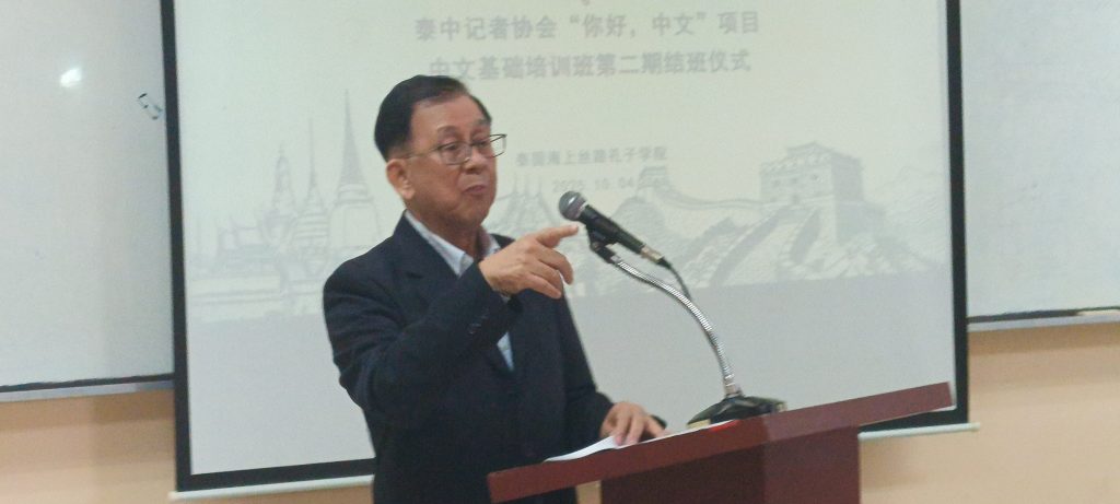 ด้าน รศ.เฉิน เวย ผู้อำนวยการสถาบันขงจื่อเส้นทางสายไหมทางทะเล (ฝ่ายจีน) กล่าวว่า รู้สึกยินดีที่ได้เข้าร่วมพิธีและเห็นพัฒนาการของผู้เข้าอบรม ซึ่งเกิดขึ้นจากความร่วมมือระหว่างสมาคมผู้สื่อข่าวไทย–จีนกับสถาบันขงจื่อ โดยหลักสูตรนี้จัดต่อเนื่องรวม 12 ครั้ง และเคยจัดมาก่อนหน้าหลายรุ่นแล้ว ผู้เข้าอบรมสามารถสื่อสารภาษาจีนขั้นต้นได้แล้ว ถือเป็นผลลัพธ์ที่น่าชื่นชม