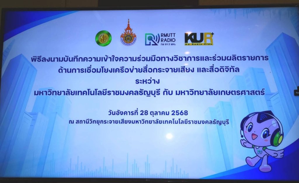 อังคารที่ 28 ตุลาคม 2568 เวลา 13.30 น. ณ สถานีวิทยุกระจายเสียงมหาวิทยาลัยเทคโนโลยีราชมงคลธัญบุรี มหาวิทยาลัยเกษตรศาสตร์ โดย สถานีวิทยุกระจายเสียงมหาวิทยาลัยเกษตรศาสตร์ ลงนามบันทึกข้อตกลงความร่วมมือทางวิชาการร่วมกับ มหาวิทยาลัยเทคโนโลยีราชมงคลธัญบุรี โดย สถานีวิทยุกระจายเสียงมหาวิทยาลัยเทคโนโลยีราชมงคลธัญบุรี ในด้านการส่งเสริมและเผยแพร่ข้อมูล ข่าวสาร ผ่านช่องทางสื่อกระจายเสียง โดยได้รับเกียรติจาก ผู้ช่วยศาสตราจารย์ ดร.กฤษณ์ วันอินทร์ รองอธิการบดีมหาวิทยาลัยเกษตรศาสตร์ เป็นผู้ลงนามฝ่ายมหาวิทยาลัยเกษตรศาสตร์ และ ศาสตราจารย์ ดร.กฤษณ์ชนม์ ภูมิกิตติพิชญ์ รองอธิการบดีมหาวิทยาลัยเทคโนโลยีราชมงคลธัญบุรี เป็นผู้ลงนามฝ่ายมหาวิทยาลัยเทคโนโลยีราชมงคลธัญบุรี