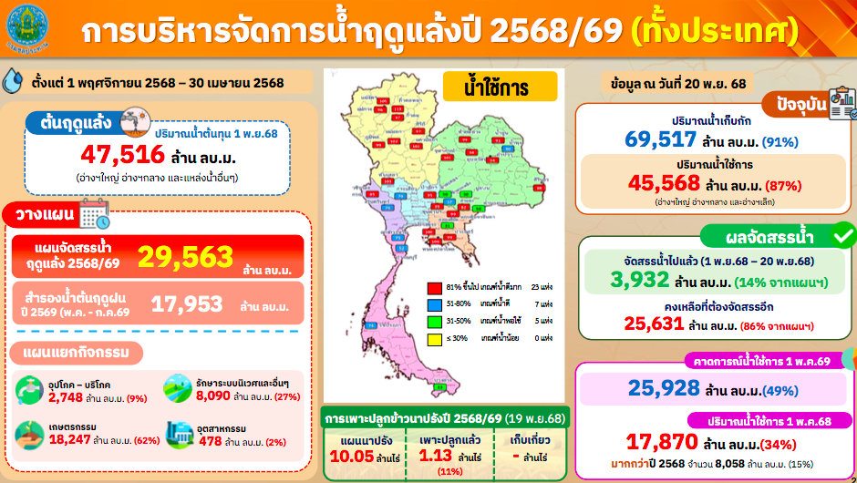 สำหรับแผนการจัดสรรน้ำและการปลูกพืชฤดูแล้งปี 2568/69 ซึ่งจะเริ่มตั้งแต่วันที่ 1 พฤศจิกายน 2568 นั้นได้วางแผนจัดสรรน้ำจากปริมาณน้ำต้นทุนจากอ่างเก็บน้ำขนาดใหญ่ ขนาดกลาง และแหล่งน้ำอื่นๆ ทั่วประเทศรวมทั้งสิ้น 47,516 ล้านลบ.ม. ใกล้เคียงกับปีที่ผ่านมา โดยในส่วนนี้จะสำรองน้ำไว้ใช้ในช่วงต้นฤดูฝนปี 2569 จำนวน 17,953 ล้าน ลบ.ม. ดังนั้นจะมีปริมาณน้ำต้นทุนเพื่อจัดสรรใช้ในกิจกรรมต่างๆในช่วงฤดูแล้งปี 2568/69 จำนวน 29,563 ล้าน ลบ.ม. โดยวางแผนจัดสรรเพื่อการอุปโภคบริโภค 2,748 ล้านลบ.ม. คิดเป็น 9% ของปริมาณน้ำต้นทุน เพื่อรักษาระบบนิเวศ 8,090 ล้าน ลบ.ม. คิด 27% ของปริมาณน้ำต้นทุน เพื่อเกษตรกรรม 18,247 ล้าน ลบ.ม. คิดเป็น 62%ของปริมาณน้ำต้นทุน ที่เหลือจะจัดสรรเพื่ออุตสาหกรรมและอื่นๆจำนวน 478 ล้าน ลบ.ม. คิดเป็น 2% ของปริมาณน้ำต้นทุน