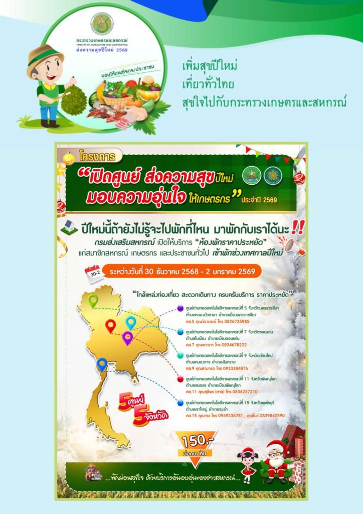 กรมส่งเสริมสหกรณ์เปิดพื้นที่ศูนย์ถ่ายทอดเทคโนโลยีการสหกรณ์เพื่อให้บริการห้องพักราคาประหยัด                  แก่สมาชิกสหกรณ์ กลุ่มเกษตรกร และประชาชนทั่วไป ในช่วงเทศกาลปีใหม่ จำนวน 5 แห่ง ใน 5 จังหวัดท่องเที่ยว ได้แก่ ศูนย์ถ่ายทอดเทคโนโลยีการสหกรณ์ที่ 5 อำเภอเมืองนครราชสีมา จังหวัดนครราชสีมา ศูนย์ถ่ายทอดเทคโนโลยีการสหกรณ์ที่ 7 อำเภอเมืองขอนแก่น จังหวัดขอนแก่น ศูนย์ถ่ายทอดเทคโนโลยีการสหกรณ์ที่ 9 อำเภอสันทราย จังหวัดเชียงใหม่ ศูนย์ถ่ายทอดเทคโนโลยีการสหกรณ์ที่ 11 อำเภอวังทอง จังหวัดพิษณุโลก และศูนย์ถ่ายทอดเทคโนโลยีการสหกรณ์ที่ 15 อำเภอชะอำ จังหวัดเพชรบุรี ในราคา 150 บาทต่อคนต่อคืน เปิดให้เข้าพักระหว่างวันที่ 30 ธันวาคม 2568 – 2 มกราคม 2569 เพื่อเป็นอีกหนึ่งทางเลือกในการท่องเที่ยวพักผ่อนอย่างประหยัดและอบอุ่นในช่วงเทศกาลแห่งความสุข