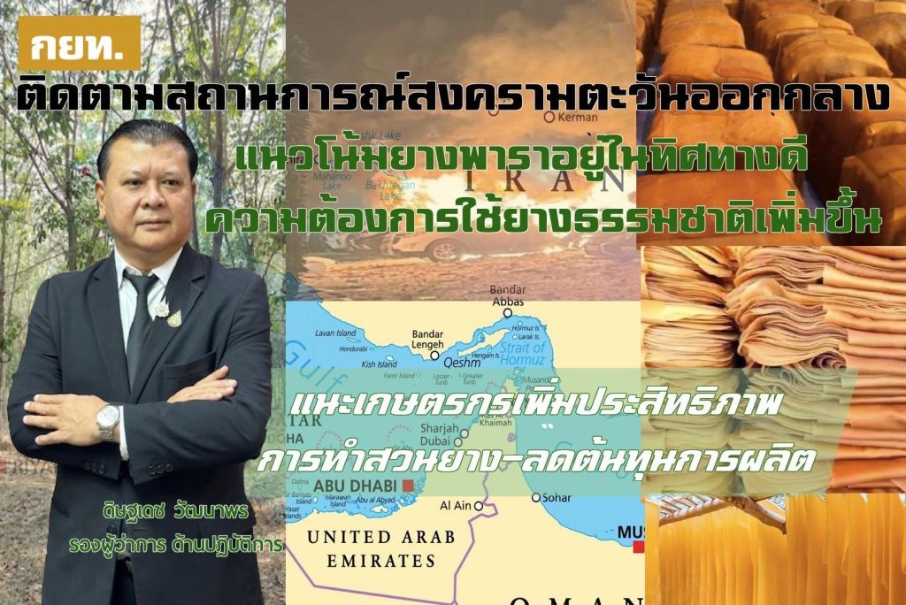 กยท. ประเมินสถานการณ์ตะวันออกกลาง ส่งผลต่อภาพรวมยางพาราไทยในหลายมิติ คาดตลาดโลกมีแนวโน้มใช้ยางธรรมชาติทดแทนยางสังเคราะห์มากขึ้น ผนวกกับปริมาณผลผลิตที่ออกสู่ตลาดในบางช่วงยังไม่เพียงพอต่อความต้องการ ส่งผลให้ทิศทางราคายางยังอยู่ในเกณฑ์ที่ดีพร้อมแนะชาวสวนยางพัฒนาเพิ่มประสิทธิภาพการผลิต บริหารต้นทุน ควบคู่อาชีพเสริมในสวนยาง สร้างความมั่นคงด้านรายได้ในระยะยาว