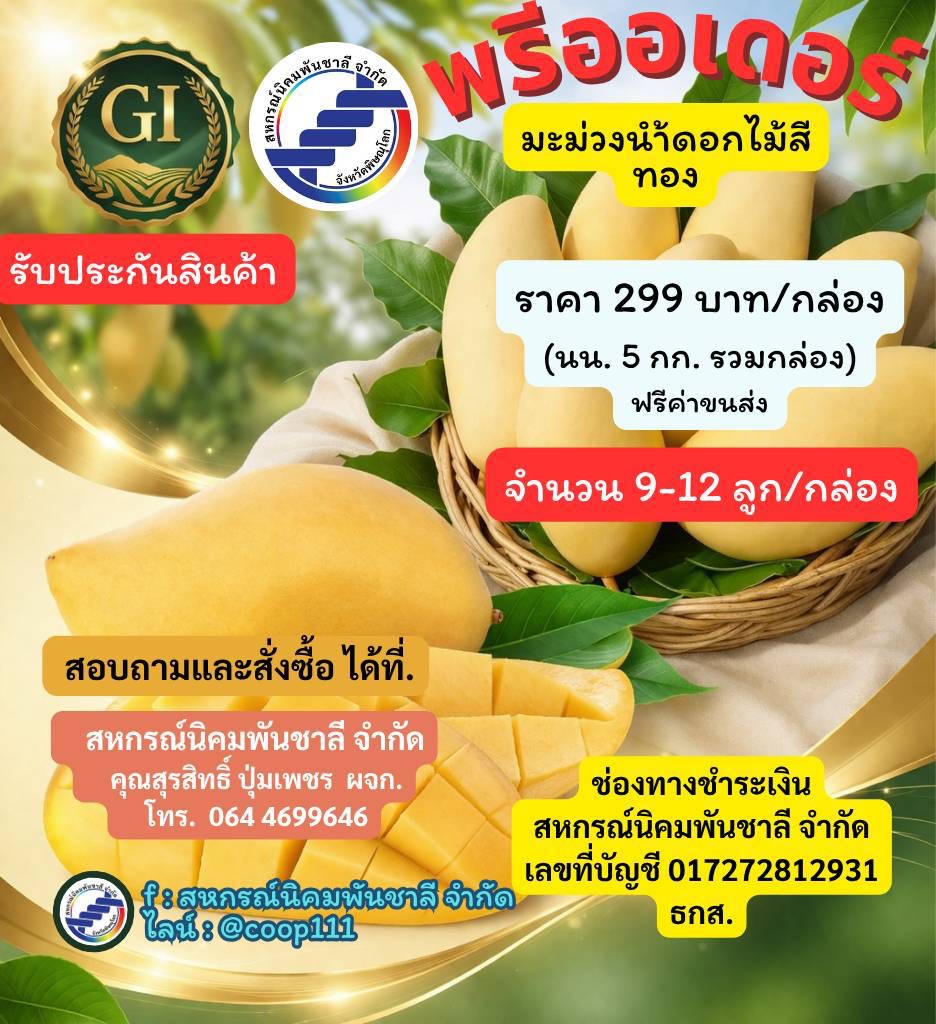 นางพิชญ์สิณีย้ำด้วยว่า เบื้องต้น สหกรณ์ได้ส่งมะม่วงไปจำหน่ายแล้ว มีปริมาณ 12.495 ตัน รวมมูลค่า 190,370 บาท รวม 4 สายพันธุ์ คือ มะม่วงน้ำดอกไม้สีทอง มะม่วงน้ำดอกไม้เบอร์ 4 มะม่วงเขียวเสวย และมะม่วงเพชรบ้านลาด ซึ่งเป็นมะม่วงที่ผ่านการคัดเกรดอย่างดี บรรจุใส่ลังส่งไปจำหน่ายยังเครือข่ายสหกรณ์ในเขตภาคใต้ผ่านสำนักงานสหกรณ์จังหวัดสุราษฎร์ธานี ยะลา ปัตตานี ตรัง สงขลา พัทลุง เพื่อช่วยกระจายผลผลิตมะม่วง                 สู่ผู้บริโภคโดยตรง โดยกรมส่งเสริมสหกรณ์ สนับสนุนค่าบริหารจัดการด้านการตลาดผลไม้ให้แก่สหกรณ์ที่เข้าร่วมโครงการสนับสนุนการกระจายผลไม้เพื่อยกระดับราคาของสถาบันเกษตรกร ปี 2569 สนใจสั่งซื้อติดต่อ                    กลุ่มส่งเสริมและพัฒนาธุรกิจสหกรณ์ สนง.สหกรณ์จังหวัดพิษณุโลกโทร.055 -983567 ต่อ 108